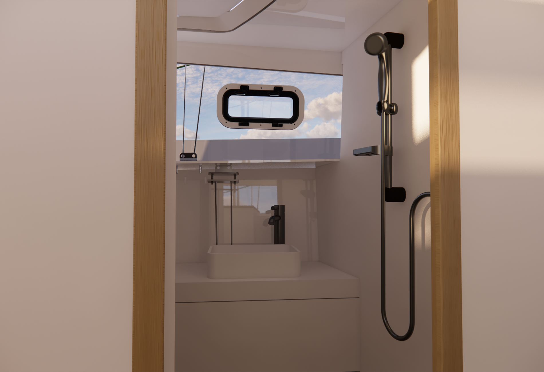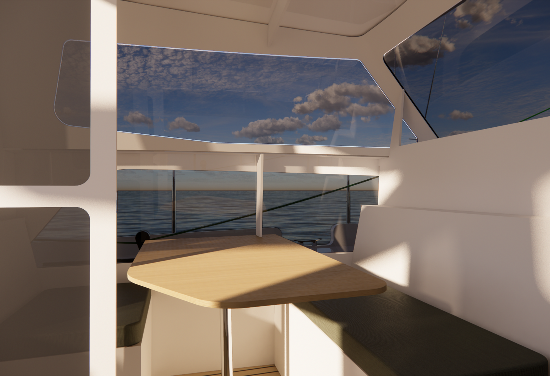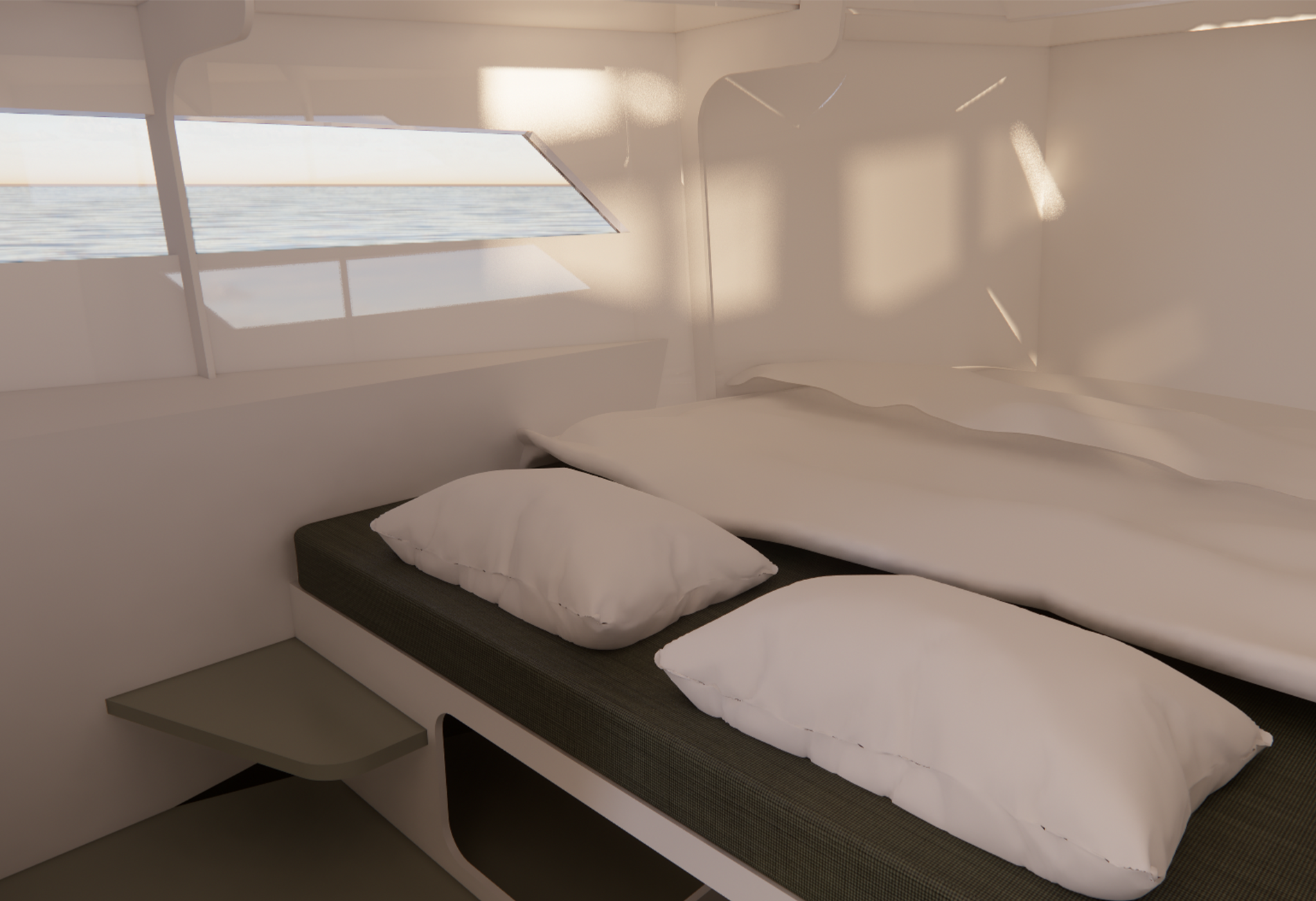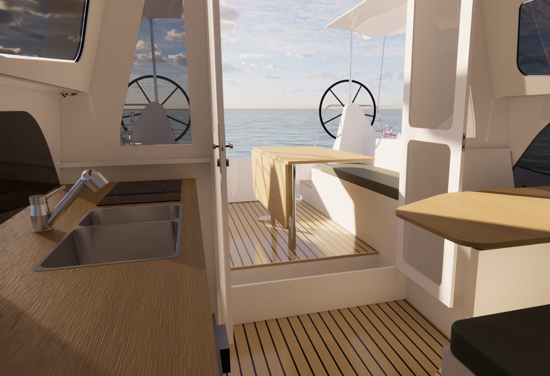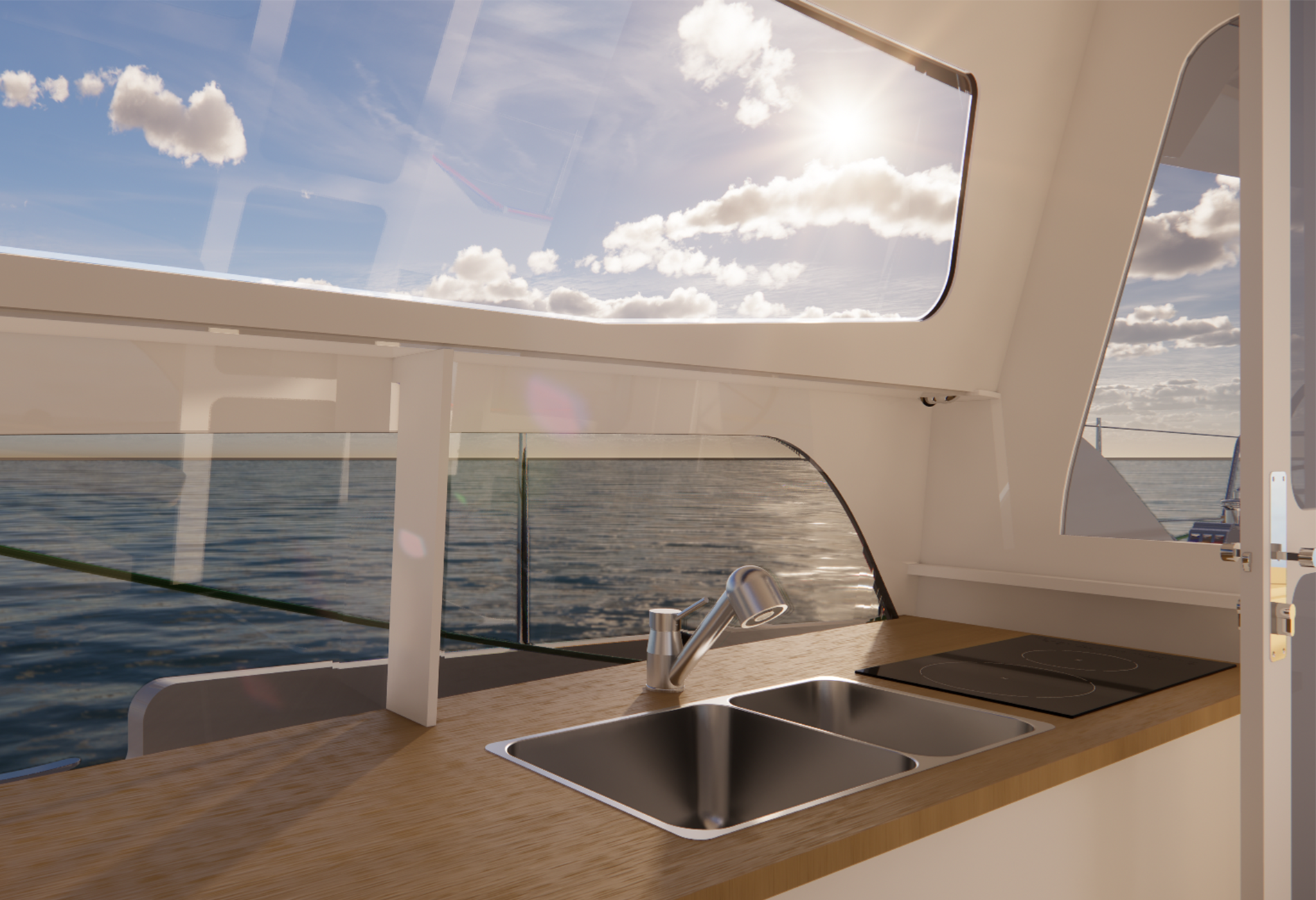 As a result, the Larelya 32′ is presented as a semi-monohull. A single small step separates the living areas, making it easier to move around and improving overall comfort. In addition, this careful ergonomics brings the experience closer to that of a multihull while retaining the sailing finesse of a monohull. Thanks to this approach, the boat clearly stands out as a unique vessel.