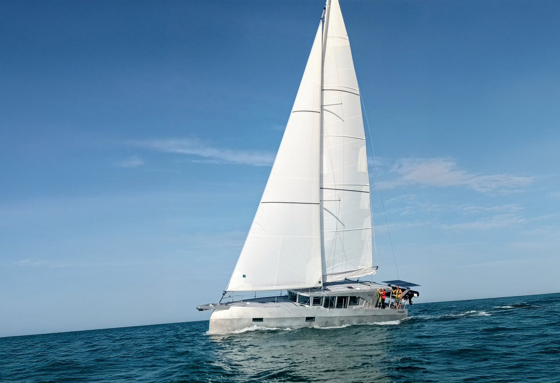 Combien de fois par jour utilisons-nous ces fameux escaliers de descente ? 4 voire parfois 5 marches parfois abruptes et qui trop souvent nous semblent nous faire « descendre à la cave » alors que la lumière et la vision sur la mer sont « en haut »… Pourquoi descendre alors que le cockpit, les convives et la vie se trouvent en haut ? Ces marches sont nombreuses et par ailleurs potentiellement dangereuses lorsque l’on remonte des plats, des assiettes ou tout simplement un livre de poche alors que le bateau bouge en mer et parfois même au mouillage. Disposer d’un intérieur en phase avec le cockpit, c’est le choix qu’ont adopté les concepteurs et constructeurs de catamarans que nous sommes aussi. Et quel bonheur de passer de l’extérieur à l’intérieur sans avoir à perdre en visibilité, continuer de garder un œil sur les bateaux alentours lors d’une veille et ne pas prendre de risque dans ses déplacements ! C’est notre philosophie du voilier aluminium de voyage, c’est la philosophie de notre gamme ISMERIA !